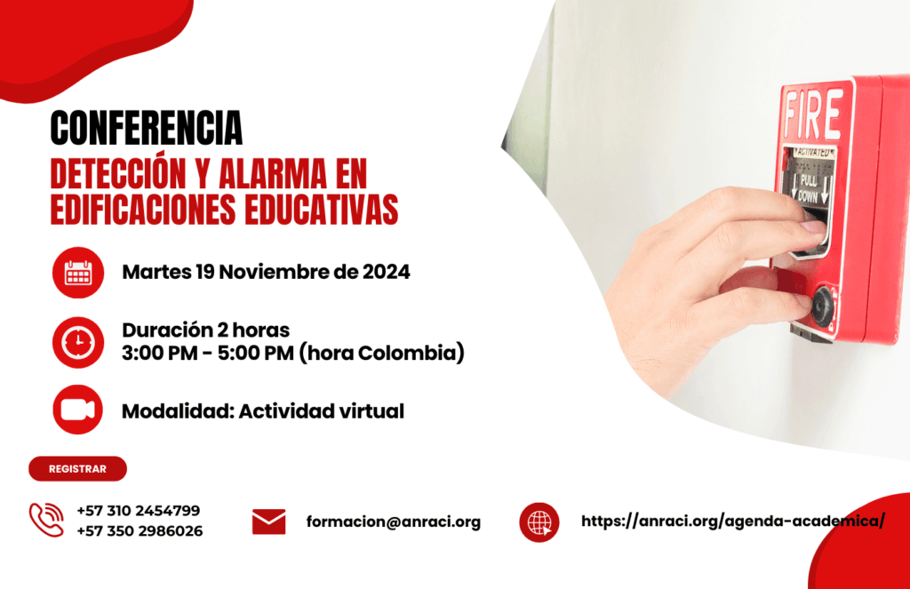 Academia 2024BlogEventos por ANRACI - 7 noviembre 20247 noviembre 2024Conferencia Virtual: Detección y Alarma en Edificaciones EducativasEsta conferencia proporciona al participante los principales criterios de diseño, las tipologías de sistemas de detección y alarma en edificaciones educativas.La conferencia ofrece buenas prácticas para la instalación, el uso y mantenimiento de sistemas de DetecciónConferencia: Detección y Alarma en Edificaciones EducativasInscribirmeDirigido A:Directores de Infraestructura en Instituciones EducativasJefes de Mantenimiento en en Instituciones EducativasResponsables de infraestrutura educativaPersonal de mantenimientoPersonal de proyectos y HSEQInstaladoresInspectoresCuándo y Dónde.¿Cuándo?Martes, 19 de Noviembre de 2024.¿Dónde?Modalidad Virtual¿Cuál es el Horario?De 3:00 pm a 5:00 pm (Hora Local Colombia GMT -5)InscribirmeMetodología.Esta conferencia se desarrollará de manera virtual.La formación incluye una galería de vídeos e imágenes que complementan los conocimientos en el tema de Detección y Alarma contra incendiosInscribirmePrograma Académico.InicioFinDuración(Min)ActividadResponsable15:0015:033Registro e ingreso a la plataforma.Asistentes al Evento.15:0315:107Bienvenida y presentación del certamen.ANRACI.15:1015:2515Introducción: Marco Normativo y Legislación aplicable.Ing. William Pacheco- Mapache.15:2515:5530 1. Tecnologías de detección aplicables a Edificaciones EducativasIng. William Pacheco- Mapache.15:5516:25302. Sistemas de Audio evacuación.Ing. Carlor Guerrero- Potter Signal.16:2516:55303. Buenas prácticas de instalación y funcionamiento.Ing. Carlor Guerrero- Potter Signal.16:5517:005Cierre de Actividades.ANRACI.InscribirmeConferencistasWilliam Pacheco, Gerente Técnico de MapacheIngeniero William Pacheco.William es Ingeniero Electrónico con amplio conocimiento en gestión de diseño, implementación, precommissioning y commissioning de sistemas contra incendio para la industria petrolera.William es Master en Project Management y tiene una gran experiencia en la aplicación de normativa para montajes industriales contra incendio y gestión de proyectos en todas las áreas de conocimiento y grupos de procesos.Actualmente se desempeña como Gerente Técnico de MaPache Mantenimientos y Montajes LTDA, organización de la cual es Socio Fundador.Carlos GuerreroIngeniero Electrónico (+30 años) con estudios de maestría en Ingeniera Electrónica.Actualmente se desempeña como Latin America Regional Sales Manager & Field Technical Support de POTTER.Certificado Especialista de la NFPA en Protección de Incendios (CFPS) e IPM de sistemas de rociadores (CEIPMSR).Bombero graduado (+25 años). Miembro del grupo asesor de la NFPA del programa Certified Fire Protection Specialist (CFPS).Líder de equipo ganador del premio ALAS – 2.017 (sector público) como el 2do. Mejor Proyecto de Seguridad de América Latina y el Caribe. Miembro activo de ANRACI y AMRACI, formando parte de los respectivos comités de Detección y Alarmas de Incendios (ANRACI y AMRACI).Instructor ALAS en Detección de incendios, CCTV nivel 1 e Intrusión.Articulista de importantes revistas especializadas de la región. Diseñador Líder de múltiples proyectos en sistemas de detección y alarmas de incendios. Consultor en sistemas de bombas contra incendios, detección y alarmas de incendios y supresión de incendios con agente limpio / CO2. Facilitador de cursos varios en protección contra incendios.Dilatada experiencia en dirección de obras de sistemas de protección contra incendios (extinción y detección).Amplia experiencia como Gerente Técnico en empresas del sector.Inscripciones.Realiza tu inscripción en el siguiente botón:InscribirmeUna vez realizada tu inscripción, en próximos días recibirás un correo en el que te suministraremos información adicional para la asistencia al evento.Al inscribirte aceptas voluntariamente nuestros términos y condiciones y nuestra política de privacidad, la cual puede ser consultada en http://anraci.org/politica-de-privacidad/Constancia de asistencia.La asistencia al evento será certificada por ANRACI, para lo cual es importante tener presente los siguientes aspectos.La inscripción en el evento debe llevarse a cabo a través de la plataforma electrónica dispuesta para tal fin.La asistencia al evento es totalmente gratuita.El certificado de asistencia del evento será realizado por Anraci y tendrá costo de $178.500 COP – 45 USDEl certificado se otorgará a las personas que diligencien su asistencia conforme con las indicaciones dadas durante el evento.Nota: El presente evento no otorga créditos (académicos) dentro de la Estructura Académica establecida por Anraci.El certificado solo acredita la asistencia a la conferencia.InversiónSi deseas obtener la certificación de tu asistencia, deberás pagar por el certificado $178.500 COP – 45 USD, pero si eres asociado ANRACI, obtienes un descuento del 20% en tu certificadoForma de Pago.En Anraci queremos ofrecerte la mayor cantidad de posibilidades para que puedas efectuar tus pagos, tenemos varias opciones para que puedas elegir la que más se ajuste a tus necesidades.Tu comodidad es muy importante para nosotros!A continuación te contamos las alternativas que tenemos para ti!Transferencia BancariaDe igual forma, podrás hacer tus pagos a través de transferencia bancaria, esta alternativa esta habilitada para pagos tanto en Colombia como desde el exterior.Tan solo debes indicarnos que la transferencia bancaria es tu elección y nosotros te proporcionaremos los datos necesarios para realizar la transacción.Para transacciones en Colombia también podrás hacer tu pago por medio de consignación bancaria.Tarjetas de Crédito.Nuestra pasarela de pagos es Wompi, de Bancolombia, aceptamos todas las tarjetas de crédito.Puedes hacer el pago de tu Curso utilizando tu tarjeta de crédito. El cargo puede ser efectuado de forma presencial o utilizando 