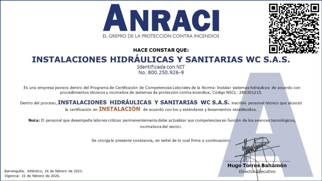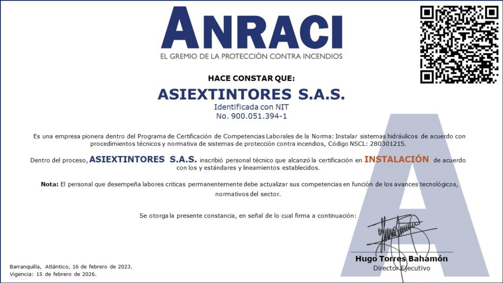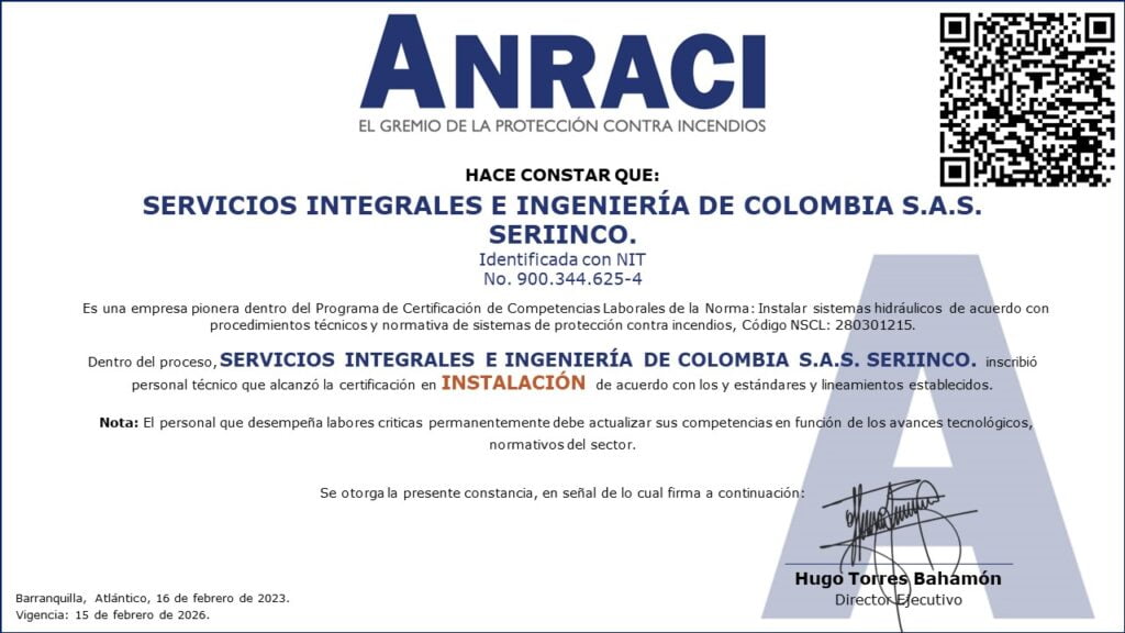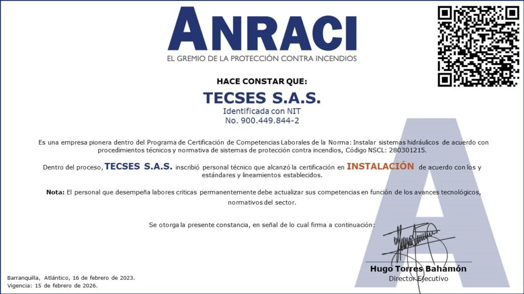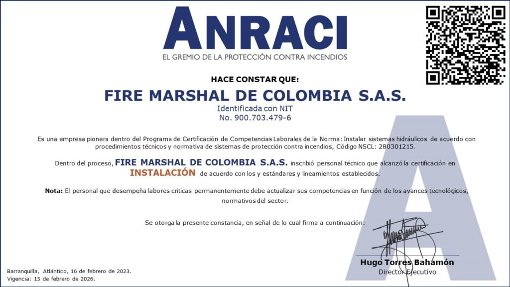 Gracias a este proceso, Colombia cuenta con los primeros técnicos certificados por competencias laborales como instaladores de Sistemas Hidráulicos de Extinción de Incendios, de esta forma continuamos con el proceso de profesionalización del personal adscrito a nuestro sector y que lleva a cabo actividades criticas en el marco de la protección contra incendios.