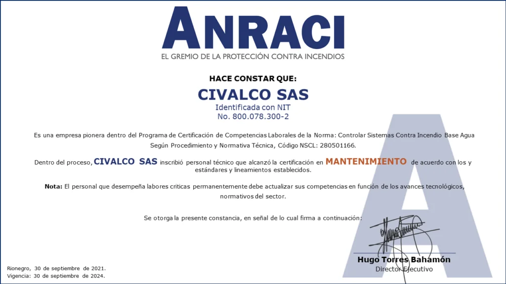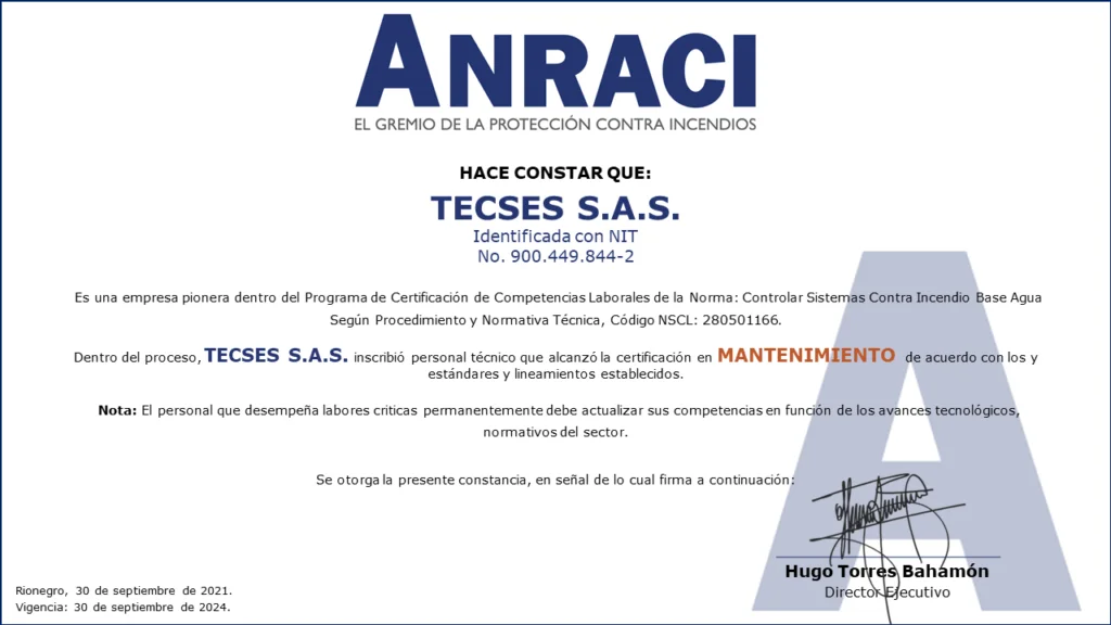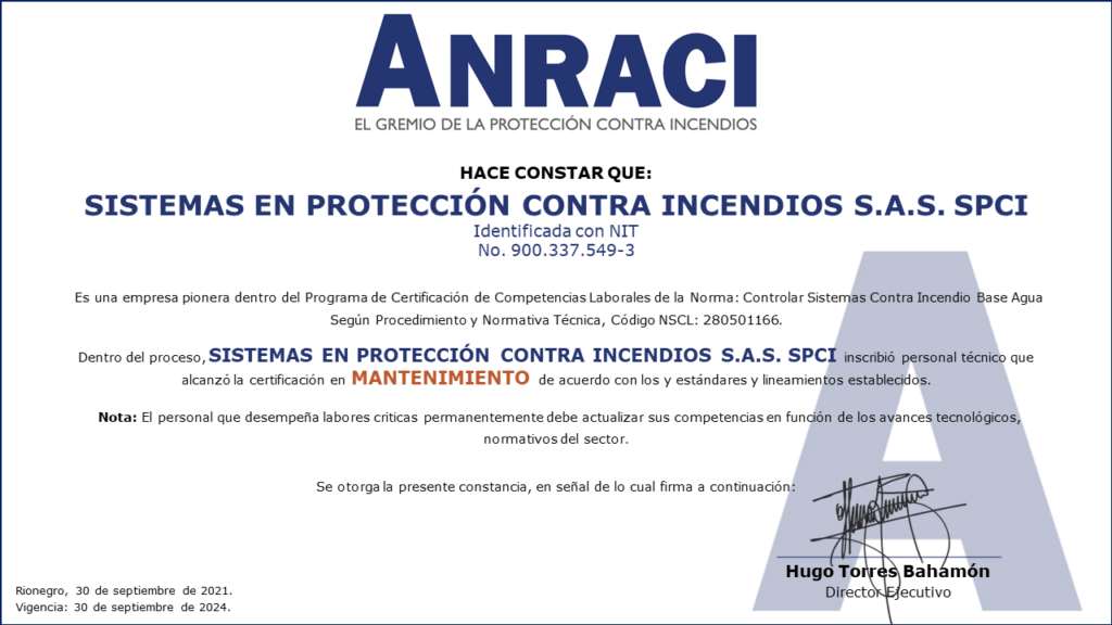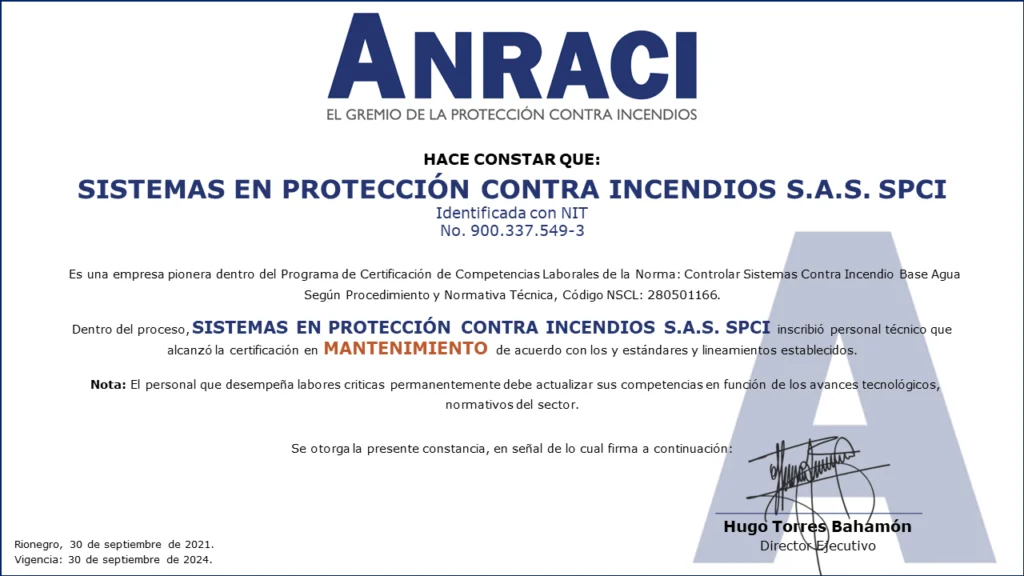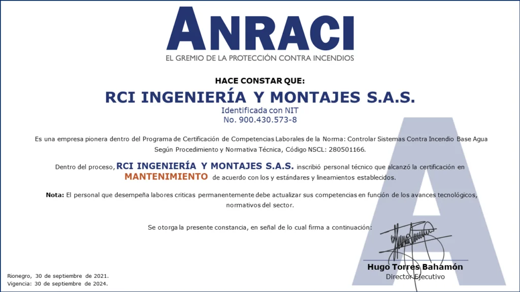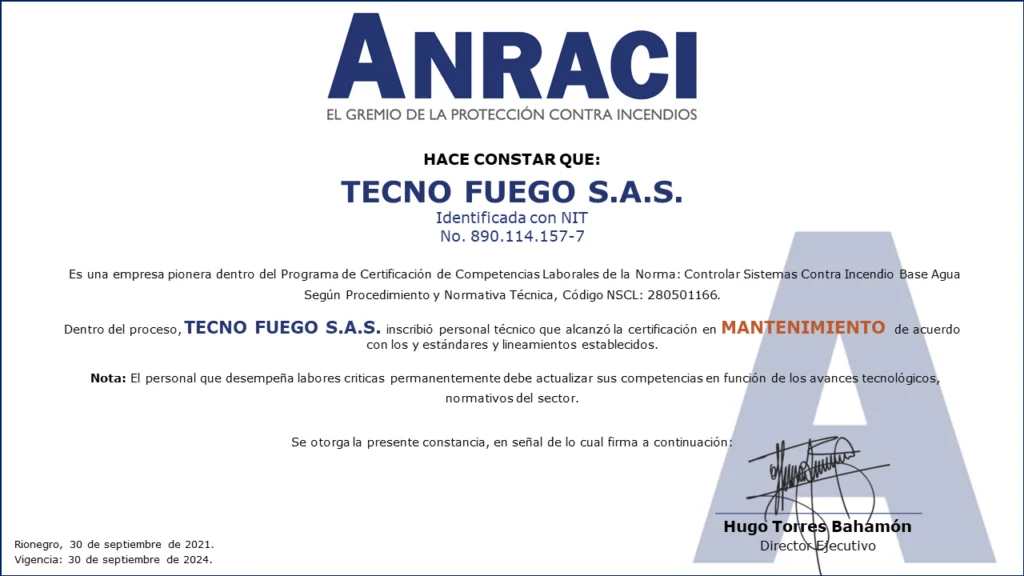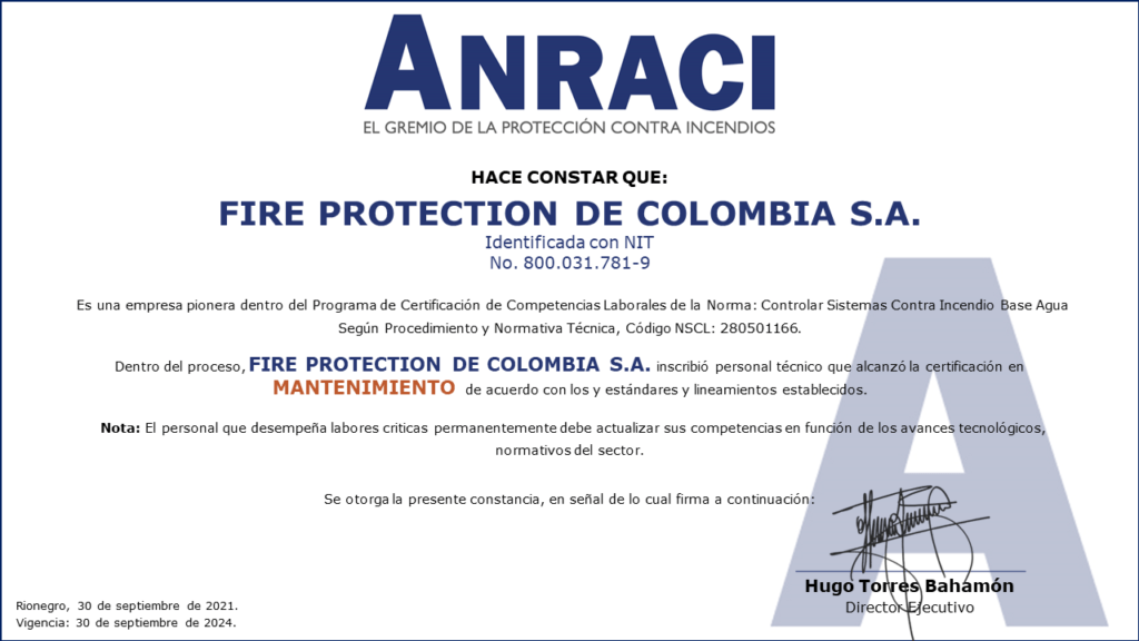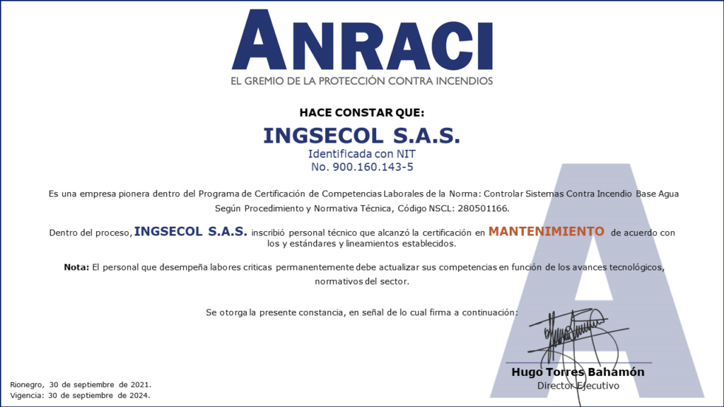 Personal Certificado en MantenimientoColombia cuenta con las primeras 161 personas certificadas en Mantenimiento de Sistemas de Protección Contra Incendios a Base Agua!!!Desde el Comité de Competencias Laborales se ha venido trabajando en conjunto con el SENA en el desarrollo de las herramientas necesarias para que los Profesionales y Técnicos de nuestro gremio puedan obtener la Certificación de Competencias Laborales de Mantenimiento de Sistemas de Protección Contra Incendios (sistemas de rociadores base agua).Este Proceso de Certificación se llevó a cabo con fundamento en la Norma Sectorial de Competencia Laboral: Controlar Sistemas Contra Incendio Base Agua Según Procedimiento Y Normativa Técnica, Código NSCL: 280501166.280501166 Controlar sistemas contra incendio base agua segun procedimiento y normativa tecnicaDescargaEste es el primer proceso de certificación de personas para el sector de la Protección Contra Incendios en Colombia.Las actividades se desarrollaron entre mayo de 2020 y septiembre de 2021, con lo que se alcanzó uno de los objetivos más importantes planteados desde el Comité de Competencias Laborales al contar con los primeros técnicos certificados por el SENA para el mantenimiento de sistemas de protección contra incendios a base agua.Fases del procesoEl Proceso de certificación de competencias laborales constó de tres fases:1. Inscripción. Mediante correo electrónico se hizo divulgación oficial del proceso de certificación de competencias a los Asociados de ANRACI, convocando a los interesados para ser parte del proceso.Esta fase se dividió en dos actividades.Envío de documentación por parte de los interesados. Documentos requeridos de acuerdo con los parámetros del SENA. El número de interesados que envío documentación superó las expectativas que se tenían. Esta convocatoria contó con la participación de 372 personas.Validación del cumplimiento de requisitos. Se verificó el cumplimiento de los estándares establecidos por el SENA para el desarrollo de la Certificación de Competencias.Luego de la validación, se evidenció que algunos candidatos no podrían continuar la Certificación por no cumplir los requisitos del SENA, de esta forma, 272 personas iniciaron el proceso.De acuerdo con la cantidad de personas inscritas, se dividió el proceso grupos, para efectos de facilitar la coordinación y logística de las actividades en ejecución.2. Sensibilización e Inducción.De acuerdo con lo estipulado por el SENA, la Sensibilización es una actividad de carácter obligatorio para todos los participantes, la cual se realizó por medio de reuniones virtuales, cada una de las cuales se programó en diferentes fechas y horarios para facilitar el acceso de las personas.Durante la Sensibilización se explicaron los requisitos, metodología y evaluación diseñadas en el marco de la Certificación de Competencias SENA.3. Evaluación Competencia Laboral.Esta fase consta de dos evaluaciones por medio de las que se identifica la competencia laboral de cada candidato: Conocimiento y Desempeño.Conocimientos (Teórico)Se medió el conocimiento teórico de acuerdo con la Norma Sectorial, asi como los conocimientos adquiridos por el candidato para el desarrollo de sus actividades.Desempeño (En la práctica)Se estableció un cronograma específico de trabajo, donde cada aspirante tuvo dos horas disponibles para demostrar sus competencias.Está programación fue realizada uno a uno con cada persona.Asi las cosas, el evaluador del SENA se comunicó con cada candidato, evidenciando la experticia de acuerdo con lo establecido en la Norma Sectorial de Competencias Laborales.LA CERTIFICACIÓN EN DATOS.EMPRESAS PARTICIPANTES.ACCESORIOS Y SISTEMAS S.A. – ACCEQUIP.AGNIS S.A.SASHES FIRE COLOMBIA S.A.S.ASIEXTINTORES S.A.S.CIVALCO S.A.S.EHR S.A.S.F.E.M. INGENIERÍA S.A.S.FIRE MARSHAL DE COLOMBIA S.A.S.FIRE PROTECTION DE COLOMBIA S.A.HEDAGA S.A.I.H.C S.A.S. INGENIERIA HIDRÁULICA Y CIVILINGSECOL S.A.S.INSTALACIONES HIDRÁULICAS Y SANITARIAS W.C. S.A.S.MAPACHE MANTENIMIENTOS Y MONTAJES LTDA.OSHO INGENIERÍARCI INGENIERÍA Y MONTAJES S.A.S.SERVICIOS INTEGRALES E INGENIERÍA DE COLOMBIA S.A.S.SISTEMAS EN PROTECCIÓN CONTRA INCENDIOS S.A.S. SPCITECNO FUEGO S.A.S.TECSES S.A.S. Compartir en Facebook Compartir Compartir en TwitterTweet Compartir en Linkedin Compartir