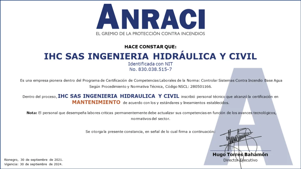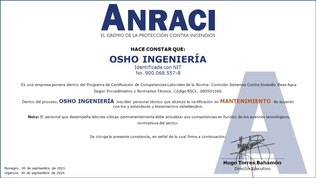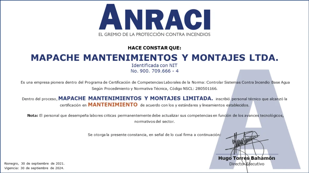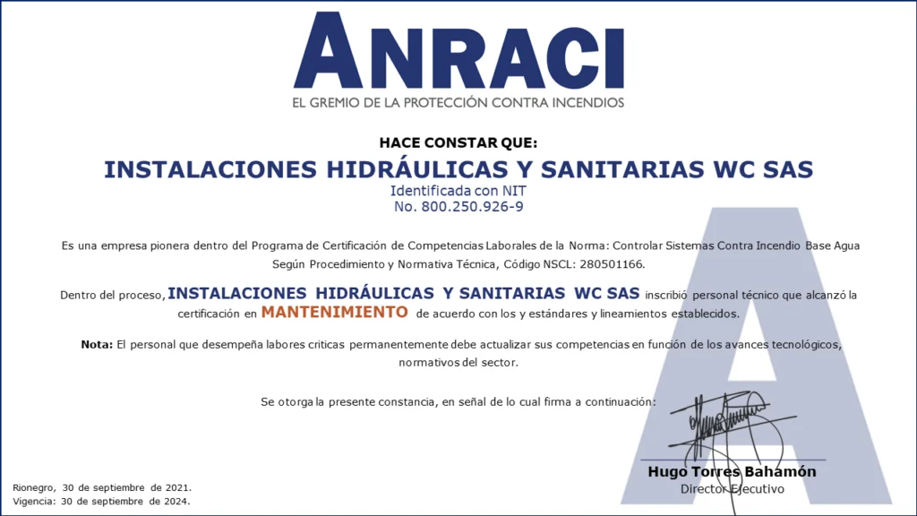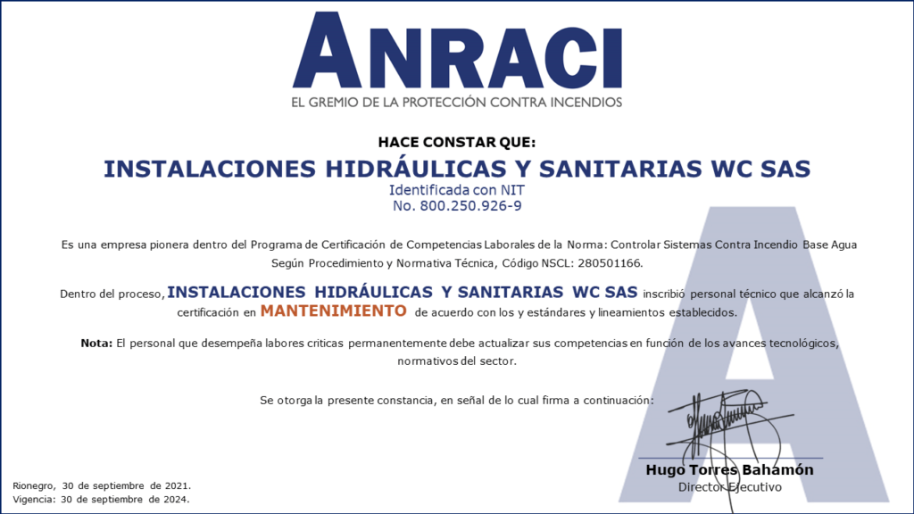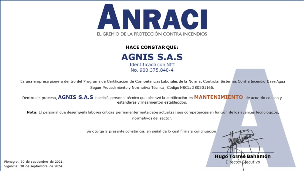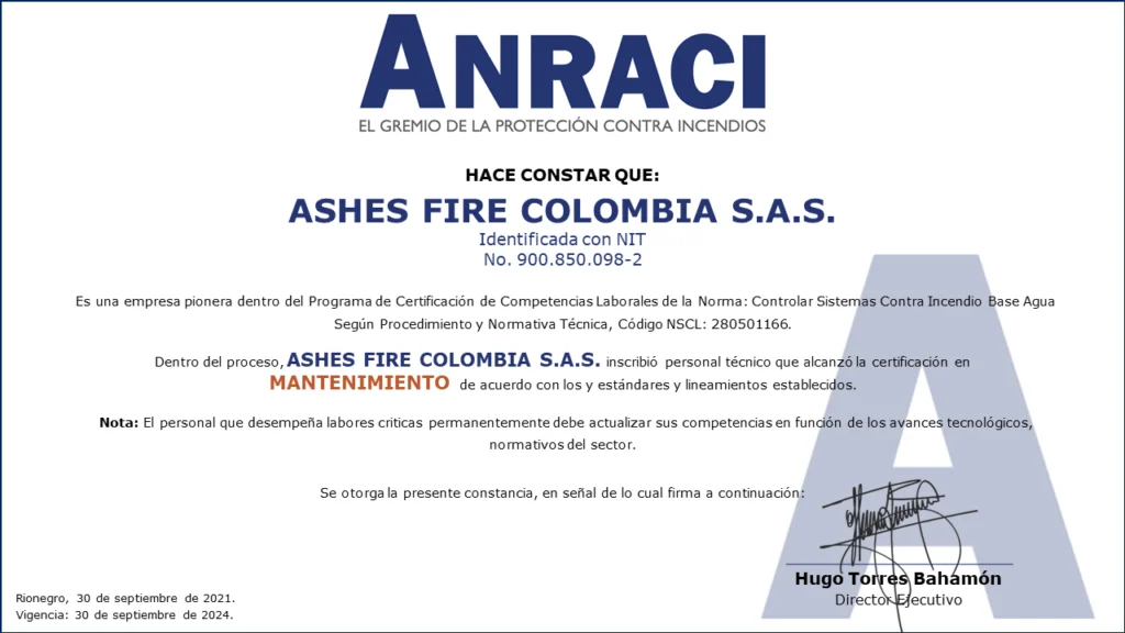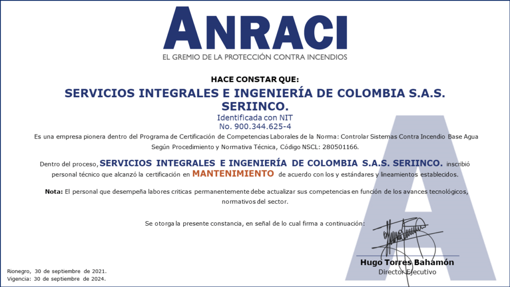 Personal Certificado en MantenimientoColombia cuenta con las primeras 161 personas certificadas en Mantenimiento de Sistemas de Protección Contra Incendios a Base Agua!!!Desde el Comité de Competencias Laborales se ha venido trabajando en conjunto con el SENA en el desarrollo de las herramientas necesarias para que los Profesionales y Técnicos de nuestro gremio puedan obtener la Certificación de Competencias Laborales de Mantenimiento de Sistemas de Protección Contra Incendios (sistemas de rociadores base agua).Este Proceso de Certificación se llevó a cabo con fundamento en la Norma Sectorial de Competencia Laboral: Controlar Sistemas Contra Incendio Base Agua Según Procedimiento Y Normativa Técnica, Código NSCL: 280501166.280501166 Controlar sistemas contra incendio base agua segun procedimiento y normativa tecnicaDescargaEste es el primer proceso de certificación de personas para el sector de la Protección Contra Incendios en Colombia.Las actividades se desarrollaron entre mayo de 2020 y septiembre de 2021, con lo que se alcanzó uno de los objetivos más importantes planteados desde el Comité de Competencias Laborales al contar con los primeros técnicos certificados por el SENA para el mantenimiento de sistemas de protección contra incendios a base agua.Fases del procesoEl Proceso de certificación de competencias laborales constó de tres fases:1. Inscripción. Mediante correo electrónico se hizo divulgación oficial del proceso de certificación de competencias a los Asociados de ANRACI, convocando a los interesados para ser parte del proceso.Esta fase se dividió en dos actividades.Envío de documentación por parte de los interesados. Documentos requeridos de acuerdo con los parámetros del SENA. El número de interesados que envío documentación superó las expectativas que se tenían. Esta convocatoria contó con la participación de 372 personas.Validación del cumplimiento de requisitos. Se verificó el cumplimiento de los estándares establecidos por el SENA para el desarrollo de la Certificación de Competencias.Luego de la validación, se evidenció que algunos candidatos no podrían continuar la Certificación por no cumplir los requisitos del SENA, de esta forma, 272 personas iniciaron el proceso.De acuerdo con la cantidad de personas inscritas, se dividió el proceso grupos, para efectos de facilitar la coordinación y logística de las actividades en ejecución.2. Sensibilización e Inducción.De acuerdo con lo estipulado por el SENA, la Sensibilización es una actividad de carácter obligatorio para todos los participantes, la cual se realizó por medio de reuniones virtuales, cada una de las cuales se programó en diferentes fechas y horarios para facilitar el acceso de las personas.Durante la Sensibilización se explicaron los requisitos, metodología y evaluación diseñadas en el marco de la Certificación de Competencias SENA.3. Evaluación Competencia Laboral.Esta fase consta de dos evaluaciones por medio de las que se identifica la competencia laboral de cada candidato: Conocimiento y Desempeño.Conocimientos (Teórico)Se medió el conocimiento teórico de acuerdo con la Norma Sectorial, asi como los conocimientos adquiridos por el candidato para el desarrollo de sus actividades.Desempeño (En la práctica)Se estableció un cronograma específico de trabajo, donde cada aspirante tuvo dos horas disponibles para demostrar sus competencias.Está programación fue realizada uno a uno con cada persona.Asi las cosas, el evaluador del SENA se comunicó con cada candidato, evidenciando la experticia de acuerdo con lo establecido en la Norma Sectorial de Competencias Laborales.LA CERTIFICACIÓN EN DATOS.EMPRESAS PARTICIPANTES.ACCESORIOS Y SISTEMAS S.A. – ACCEQUIP.AGNIS S.A.SASHES FIRE COLOMBIA S.A.S.ASIEXTINTORES S.A.S.CIVALCO S.A.S.EHR S.A.S.F.E.M. INGENIERÍA S.A.S.FIRE MARSHAL DE COLOMBIA S.A.S.FIRE PROTECTION DE COLOMBIA S.A.HEDAGA S.A.I.H.C S.A.S. INGENIERIA HIDRÁULICA Y CIVILINGSECOL S.A.S.INSTALACIONES HIDRÁULICAS Y SANITARIAS W.C. S.A.S.MAPACHE MANTENIMIENTOS Y MONTAJES LTDA.OSHO INGENIERÍARCI INGENIERÍA Y MONTAJES S.A.S.SERVICIOS INTEGRALES E INGENIERÍA DE COLOMBIA S.A.S.SISTEMAS EN PROTECCIÓN CONTRA INCENDIOS S.A.S. SPCITECNO FUEGO S.A.S.TECSES S.A.S. Compartir en Facebook Compartir Compartir en TwitterTweet Compartir en Linkedin Compartir