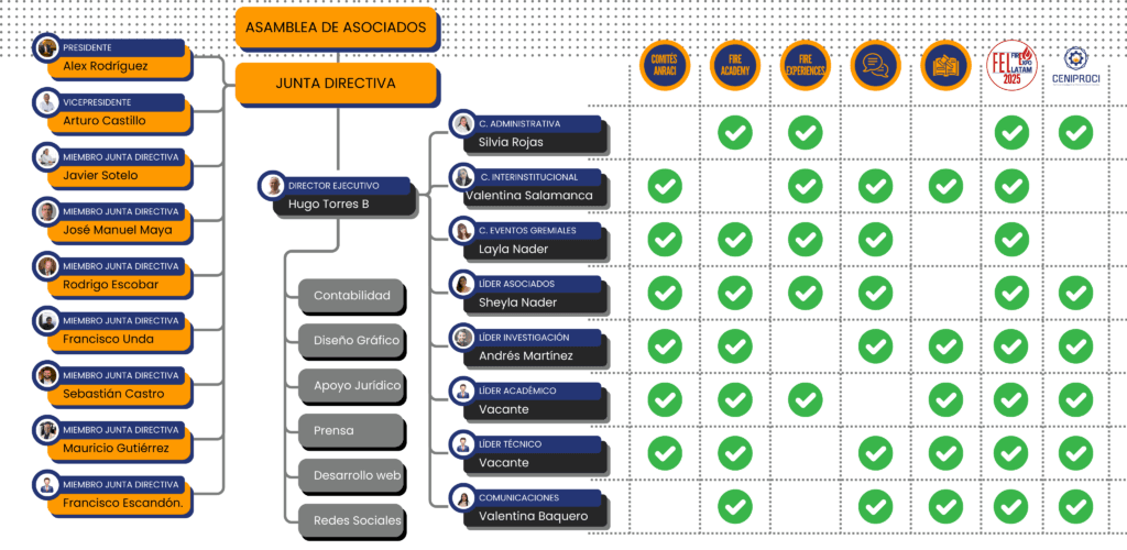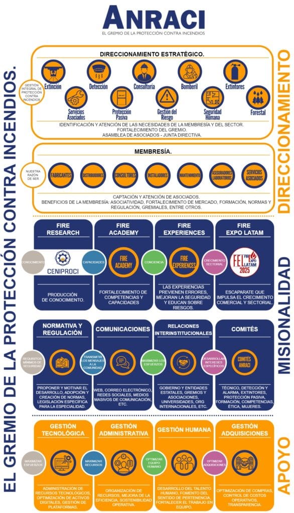 Misión y Visión – EstrategiaMisión.Mejorar las condiciones de Protección Contra Incendio en Colombia para preservar la vida y reducir las pérdidas materiales.Visión.Liderar la protección contra incendios en Colombia, influyendo en la normatividad y legislación que nos protege, guiando la formación del sector, y cultivando una comunidad bien preparada y educada.Todo mientras nos consolidamos como la autoridad de referencia en el país y como un importante articulador e influenciador en Latinoamérica, al construir un sector sólido, dinámico, abierto, participativo y propositivo frente a las problemáticas de la industria.Valores.Ética: De nuestras acciones dependen las vidas de las personas.Responsabilidad: Salvamos Vidas y Salvaguardamos los bienes.Compromiso: Hacemos lo que decimos, cumplimos lo que prometemos.Integridad: Actuamos con rectitud y honradez, nuestra conducta es intachable.Asociatividad: motor de desarrollo del bienestar común.Respeto: por la vida, las personas, las diferencias y el ambiente.Solidaridad: Nos apoyamos mutuamente por el crecimiento armónicoPrincipios fundamentales.Anraci es una Asociación Sin Ánimo de Lucro, organización centrada en el desarrollo de la Protección Contra Incendios en Colombia.Entidad abierta, autónoma, independiente, ecuménica, que congrega a todos los actores involucrados dentro de la industria (PCI) en el país.La Institución genera beneficios para la Sociedad Colombiana al promover la implementación de altos estándares de calidad en materia de Protección Contra Incendios.Políticas.La vida es lo más importante.Trabajamos unidos por una sociedad resiliente y sostenible.Brindamos conocimiento y herramientas a nuestra comunidad para su seguridad.Apoyamos al estado promoviendo mejores condiciones de Protección Contra Incendios.Nuestras acciones generan valor para la sociedad y para nuestros asociados.Compartimos y multiplicamos el conocimiento de la Protección Contra Incendios.Nuestros Asociados son nuestra razón de ser, confían en nosotros y no los defraudaremos.Servicio, cercanía y apoyo permanente para el crecimiento del sector.Integración y crecimiento con nuestros stakeholders.Creceremos de manera responsable dentro de nuestras posibilidades.Ejes de Gestión.Concientización de la comunidad.En nuestra sociedad existe un gran desconocimiento alrededor del riesgo de incendios, lo que lleva a las personas a tomar decisiones equivocadas frente a su propia seguridad. Cambiar esta situación nos llevará por un camino mejor protegido, libre de víctimas de incendios.Concientizar a la comunidad acerca del riesgo de incendios y de la tecnología e ingeniería disponible en el mercado para mitigarlo y controlarlo llevará a las personas a mejorar su toma de decisiones, lo que redundará en mejores niveles de seguridad en el marco de un mercado dinámico y atractivo.La Protección Contra Incendios es una especialidad transversal, tiene alcance en todos los sectores y en todas las industrias, protegiendo personas, bienes e infraestructura.Es necesaria la difusión de productos, resultados, noticias, y eventos relacionados con la actualidad del sector para que la comunidad pueda acercarse a la Protección Contra Incendios y tomar decisiones pertinentes según sus intereses.Profesionalización del sector – Gestión del Conocimiento.La competencia profesional es un elemento fundamental para el desarrollo de las actividades técnicas y operativas ligadas a la Protección Contra Incendios. La industria que salva vidas, protege bienes y propende por la continuidad del negocio debe ser altamente profesional y especializada con fundamento en la formación, el conocimiento y la experiencia.La Gestión del Conocimiento alrededor del sector tiene alcance en toda nuestra sociedad, pues, sin importar el lugar en el que nos encontremos, el riesgo de incendios está presente; en algunos casos, puede ser más sencillo, en otros, más sofisticado; en todo caso, siempre existe y las personas deben estar preparadas y protegidas.La ética profesional y la ética empresarial son indispensables en el quehacer diario de los actores vinculados a la industria de la Protección Contra Incendios.La formación, las Competencias técnicas y la Certificación son temas de interés dentro del presente eje de gestión.Fortalecimiento y profundización del conocimiento técnico.Las normas, los códigos, los reglamentos, la legislación, y en general, la regulación en materia de Protección Contra Incendios es necesaria para subir el nivel de exigencia técnica que garantice mínimos básicos en materia de seguridad para la comunidad.Este conocimiento permitirá a los profesionales del sector establecer estrategias de protección más sólidas y efectivas, basadas en buenas prácticas de ingeniería que proporcionarán a la comunidad estándares de seguridad universalmente aceptados.De igual forma, el fortalecimiento y profundización del conocimiento técnico proporciona el fundamento para tener un sistema “Normativa – Consultoría – Instalación/Integración – Inspección – Puesta en Marcha”, donde cada actor tendrá sus funciones y objetivos claramente definidos para beneficio de la sociedad.El presente eje de gestión contempla:Adopción y promoción de la normatividad.Normas Técnicas Internacionales.Normas Técnicas Colombianas – NTCParticipación en el desarrollo de la normatividad Colombiana.Participación legislativa en temas relacionados con el sector.Fortalecimiento sectorial.Es necesario reconocer que la Protección Contra Incendios está compuesta por una serie de subespecialidades, cada una de las cuales aporta de manera significativa en una estrategia integrada de prevención, protección y seguridad. Por ello, se deben crear programas específicos para cada temática, promoviendo su importancia e impacto en la seguridad de las personas.Fortalecer el mercado es un imperativo, donde iniciativas como la Fire Expo Latam le