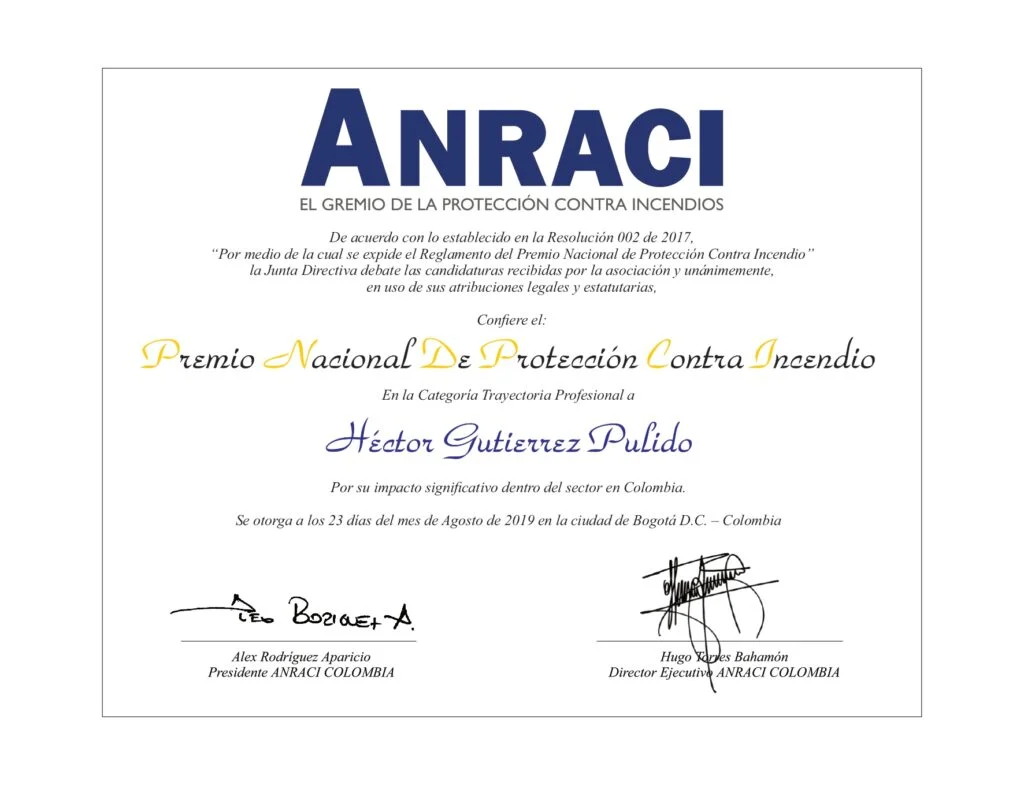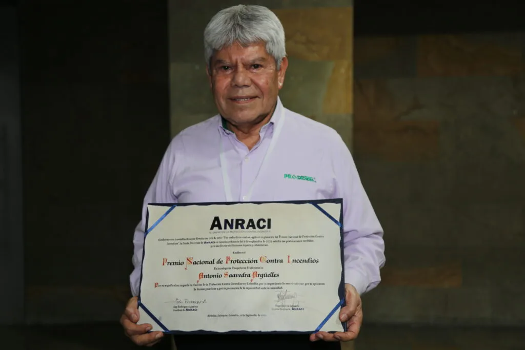 Premio Nacional de Protección Contra IncendiosConvocatoria Edición 2025.PREMIO NACIONAL DE PROTECCIÓN CONTRA INCENDIOS El Premio Nacional de Protección Contra Incendios es un reconocimiento a la labor de los profesionales y de las entidades que apuntan al fortalecimiento y crecimiento del sector. Este Premio será entregado a una persona o entidad cuyas actuaciones hayan generado un impacto significativo dentro de la Protección Contra Incendios en Colombia, estas ejecutorias pueden incluir, pero sin limitarse a, la formación de profesionales, la trayectoria profesional, la ejecución destacada de actividades en beneficio del sector. El Gremio de la Protección Contra Incendios, ANRACI, a través de su Junta Directiva, abre convocatoria para la entrega del Premio Nacional de Contra Incendio en su versión 2025 en las categorías: Trayectoria Profesional. Ejecutorías destacadas. Cualquier persona Natural o Jurídica podrá realizar la postulación al Premio (en nombre propio o de un tercero), para lo cual deberá enviar comunicación escrita a ANRACI describiendo los méritos de la persona o entidad por los cuales debería ser acreedor al galardón. La convocatoria estará abierta hasta el 4 de septiembre de 2025 a las 5.00 pm, momento en el que se cerrarán las inscripciones. Las inscripciones podrán realizarse a través de Correo Electrónico, escribiendo a anraci@anraci.org. La Entrega del Premio Nacional de Protección Contra Incendios se llevará a cabo en Sesión Solemne que se realizará en el marco de Fire Expo Latam 2025. Requisitos. La persona o entidad nominada no puede encontrarse sancionada o inhabilitada penal, judicial, disciplinariamente, ni de ninguna otra índole. Para el caso de las personas postuladas por su “Trayectoria profesional”, se deberá allegar la hoja de vida en la que se describa minuciosamente las diferentes ejecutorias adelantadas durante el ejercicio profesional. Los criterios básicos sobre los que se evaluarán las diferentes postulaciones son: Impacto (analizando factores como Tamaño de las ejecutorias, cantidad de personas impactadas, etc.) Buenas prácticas. Promoción de la Protección Contra Incendios. En caso de que a juicio de la Junta Directiva de ANRACI ninguna de las postulaciones tenga los méritos suficientes, y ninguna sea merecedora de las distinciones de la Asociación, el Premio no será entregado y se declarará desierto. Reglamento.Los detalles del Premio podrán ser consultados en la Resolución No. 002 de 2017, por medio de la cual se expide el reglamento del Premio Nacional de Protección Contra Incendio como un reconocimiento de ANRACI para las ejecutorias destacadas dentro del sector.Le Reglamentación del Premio podrá ser consultada a continuación.Resolución Premio Nacional de Protección Contra IncendiosDescargaGanadores históricos del Premio Nacional de Protección Contra Incendios.2023.Categoría Trayectoria profesional: ANTONIO SAAVEDRA ARGÜELLES.2022.No se otorgó el premio durante el año 2022.2021.Categoría Trayectoria profesional: RUSSELL P. FLEMING.2020.Categoría Ejecutorias Destacadas: CUERPO OFICIAL DE BOMBEROS DE BOGOTÁ.2019.Categoría Trayectoria Profesional: EDUARDO PADILLA NAVAS.Categoría Trayectoria Profesional: HECTOR GUTIERREZ PULIDO.2018.Categoría Ejecutorias Destacadas: ARMANDO DEVIA MONCALEANO.Categoría Trayectoria Profesional: JAIME MONCADA PÉREZ.Edición 2023.Categoría Trayectoria profesional.En la edición 2023 del Premio Nacional de Protección Contra Incendios, nos enorgullece reconocer a una figura destacada en la seguridad y protección contra incendios. Este año, el galardón ha sido otorgado a Antonio Saavedra Arguelles, cuyo compromiso y dedicación han dejado una huella imborrable en esta industria. La entrega del premio se llevó a cabo en el marco de la Fire Expo Latam, un evento que reúne a los profesionales más destacados y a las empresas más influyentes del sector.Antonio Saavedra inició su trayectoria en 1977 con un proyecto de fabricación de gabinetes para redes contra incendios y la recarga de extintores. Junto con su esposa, Luz Stella Coronado, quien asumió el área administrativa de su empresa, Antonio ha trabajado incansablemente para brindar seguridad humana y protección de patrimonios. Su empresa, PRODESEG S.A, es una fuente de empleo para muchas familias colombianas, destacándose no solo por su capacidad productiva sino también por su compromiso con la formación continua de sus colaboradores.A lo largo de su carrera, Antonio Saavedra ha recibido numerosas distinciones, entre ellas la Cruz Orden al Mérito de la comunicación social Interamericana Antonio Nariño, la Medalla Cruz de San Miguel, y la Medalla al Mérito otorgada por el Cuerpo de Bomberos Voluntarios de Bogotá. Además, ha sido reconocido con la Orden Pedro Nel Ospina y el Blasón de Oro Especial del Sistema Nacional de Bomberos, entre otros premios.El Premio Nacional de Protección Contra Incendios – Versión 2023, otorgado a Antonio Saavedra Arguelles, es un homenaje a su incansable labor y compromiso con la seguridad y la protección contra incendios. Su legado continuará inspirando a las nuevas generaciones de profesionales en este campo crucial.Felicitamos a Antonio Saavedra por este merecido reconocimiento y agradecemos su contribución invaluable a la protección contra incendios en Colombia y más allá.Edición 2021.Categoría Trayectoria profesional.En el año 2021 este importante galardón fue entregado al ingeniero Russell P. Fleming, Director Técnico y Secretario de la Alianza Internacional de Supresión de Incendios – IFSA.Durante mucho tiempo, ha trabajado para mejorar la protección contra incendios con la Asociación Nacional de Rociadores contra Incendios en los Estados Unidos NFSA.Tiene más de 30 años de servicio en el Comité de Rociadores de la NFPA 13, fue miembro de la Junta Directiva de la NFPA y fue presidente del Consejo de Normas de la NFPA.Miembro y