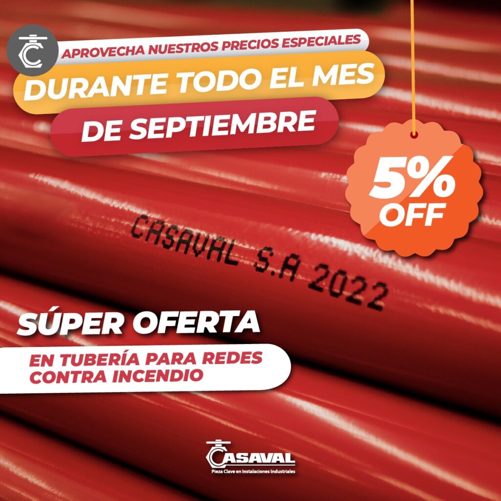 Súper Oferta Casaval!AsociaciónNoticias por ANRACI - 8 septiembre 20229 septiembre 2022 ¡En Casaval comenzamos el mes de septiembre con una Oferta Especial! Durante todo el mes de septiembre podrá aprovechar el 5% de descuento en Tubería para Redes Contra Incendio, pintada con nuestro servicio de Horno de Pintura Electrostática, asegurando excelentes acabados. Más información:Juan Carlos Suazo Gerente Comercial Teléfono:604-3206300 Ext: 16103 Celular: 315 306 1572Correo: juansuazo@casaval.net www.casaval.net www.casaval.net Compartir en Facebook Compartir Compartir en TwitterTweet Compartir en Linkedin Compartir