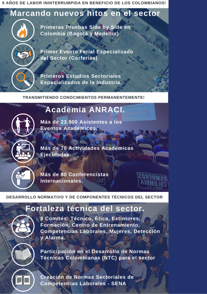 Anraci Colombia, 5 años de labor ininterrumpida Quinto Aniversario de Fundación.AsociaciónBlog por ANRACI - 21 julio 202022 febrero 2021 Hace cinco años, el 14 de julio de 2015, se protocolizó ante la Cámara de Comercio de Bogotá el nacimiento del Gremio de la Protección Contra Incendios en nuestro país!Han sido cinco años de crecimiento, construcción y continuo desarrollo, donde juntos hemos cambiado la estructura de nuestro sector, enfocando nuestros esfuerzos en el trabajo colaborativo y mancomunado en beneficio de la protección contra incendios para los colombianos.Gracias a nuestros asociados y la participación de todo el sector, hoy nuestra querida Asociación se encuentra celebrando su primer quinquenio!Como parte de nuestra celebración, queremos compartir contigo el estudio titulado: Cadena de Valor de la Protección Contra Incendios en Colombia, el cual podrás descargar a través de este enlace.Esta investigación identifica los segmentos, actores y estructura del sector, contribuyendo de esta manera con la transparencia de la protección contra incendios, facilitando la identificación de ineficiencias, y promoviendo el aumento de la competitividad en nuestra industria.La Cadena de Valor de la Protección Contra Incendios en Colombia se construyó y enriqueció con la participación de nuestra comunidad y se constituye como el primer estudio de su naturaleza en nuestro medio.Queremos agradecer infinitamente a todos nuestros Asociados, a sus equipos humanos, por ser parte de nuestra organización, por sus aportes y por construir colegiadamente el Gremio de la Protección Contra Incendios en Colombia, juntos estamos cambiando la historia de nuestro sector! Compartir en Facebook Compartir Compartir en TwitterTweet Compartir en Linkedin Compartir
