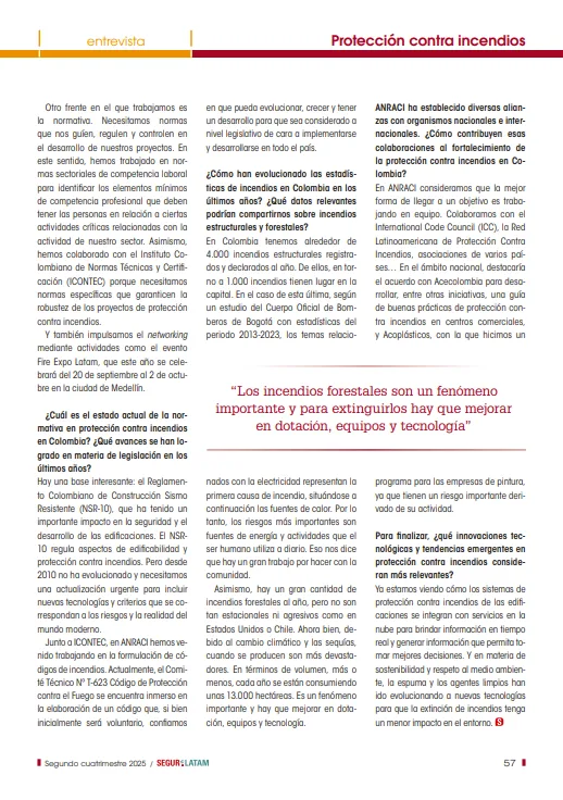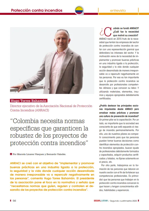 Blog Noticias por ANRACI - 20 agosto 202520 agosto 2025 ANRACI participa con un artículo en la Revista Segurilatam En la edición número 31 de Segurilatam, Hugo Torres Bahamón, el director ejecutivo de ANRACI, planteó una reflexión clave sobre la urgencia de leyes claras y fuertes para la defensa contra el fuego en Colombia y toda América Latina.El diálogo enfatiza que la seguridad contra incendios debe ser un pilar, respaldada por reglas claras, expertos capacitados y el uso de equipos contra incendios probados, lo que asegura la confianza en los sistemas instalados. Puntos clave que se trataron en la entrevista * Reglamentos al día que aseguren la defensa contra el fuego, creando proyectos seguros y bajando los peligros.* El valor de la formación y la capacitación para acabar con las malas prácticas en el campo.* Cifras recientes de incendios en Colombia, que muestran graves riesgos relacionados con la electricidad y el calor.* Colaboración entre países para mejorar la prevención y la forma de actuar en casos de emergencia.* Últimas tendencias tecnológicas en la defensa contra el fuego, como la unión con servicios en la nube y opciones ecológicas. Desde ANRACI, confirmamos nuestra apuesta por la prevención, la innovación y la creación de espacios más seguros y fuertes. Frente al aumento de los peligros —desde fuegos en edificios hasta incendios en bosques— las leyes, la formación técnica y el uso de equipos probados son clave para proteger vidas y propiedades. seglatam_031_blqDescarga También te invitamos a ver nuestro blog sobre la importancia de los equipos con certificados FM y UL en la defensa contra el fuego, donde explicamos cómo detectar copias y dar seguridad a tus proyectos. Compartir en Facebook Compartir Compartir en TwitterTweet Compartir en Linkedin Compartir