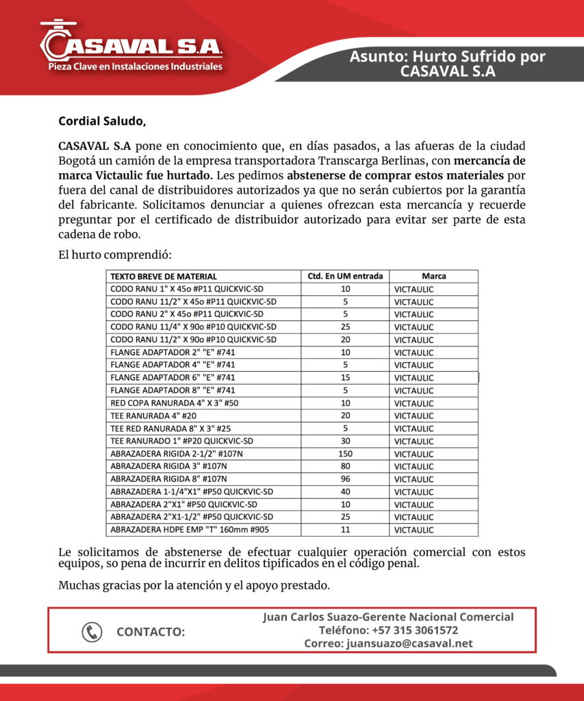 Informamos a la comunidad que en días pasados CASAVAL SA fue objeto del hurto de varios componentes utilizados en la instalación de sistemas de protección contra incendios. De manera particular, el material robado es de la marca VICTAULIC.