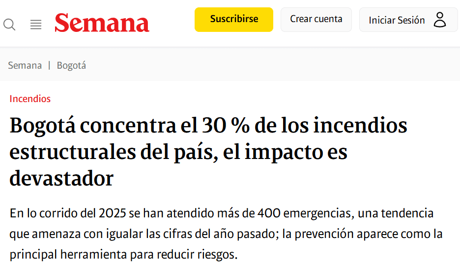 A nivel nacional, el panorama no es menos alarmante, pues Colombia registra cerca de 10 incendios estructurales diarios, y Bogotá concentra alrededor del 30 % de ellos.