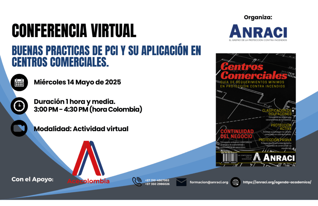 BlogEventos por ANRACI - 25 abril 202514 mayo 2025Buenas Prácticas de PCI y su aplicación enCentros Comerciales.Buenas Prácticas de PCI y su aplicación en Centros Comerciales.El Comité técnico de Anraci con el apoyo de Acecolombia invita a la comunidad, profesional e industrial a participar en esta conferencia virtual enfocada en buenas prácticas de PCI y su aplicación en Centros Comerciales, espacios que presentan desafíos únicos debido a sus estructuras.Durante esta conferencia, expertos en el sector abordarán tecnologías y normativas clave para garantizar la seguridad de estos entornos, incluyendo:Introducción a la Guía de Requerimientos Mínimos en Protección Contra Incendios para Centros Comerciales:Estándares Mínimos: Establecer los estándares mínimos necesarios para la protección contra incendios en centros comercialesÁreas de Riesgo: Enfoque en áreas de alto riesgo como cocinas de plazoletas de comidas y restaurantesEquipos y Sistemas Certificados: Importancia de contar con equipos y sistemas listados y certificadosHidráulica:Principios de Hidráulica de Tuberías: Fundamentos de hidráulica aplicados a sistemas de protección contra incendiosModelación Hidráulica: Uso de software especializado para modelar y analizar sistemas de protección contra incendiosPruebas de Capacidad Hidráulica: Pruebas en hidrantes y sistemas de rociadoresDetección:Sistemas de Detección y Alarma: Funciones y componentes principales de los sistemas de detección y alarma contra incendiosCálculo de Estrobos y Voltajes: Métodos para calcular estrobos y voltajes en sistemas de alarmaÚltimos Avances Tecnológicos: Innovaciones en sistemas de detección y alarmaSeguridad Humana:Normativa NFPA 101: Criterios de protección para diversas ocupaciones, nuevas y existentesEvacuación y Uso de Ascensores: Conceptos de evacuación y uso seguro de ascensores en edificiosIdentificación de Riesgos: Evaluación de riesgos de incendio y almacenamiento seguro de materiales.Inscribirme¿Por qué proteger los centros comerciales? Proteger los centros comerciales en cuanto a protección contra incendios (PCI) es crucial debido a la alta concentración de personas y bienes que albergan. Estos espacios presentan desafíos únicos, como la presencia de cocinas, tiendas con materiales inflamables y sistemas eléctricos complejos, que aumentan el riesgo de incendios. Implementar buenas prácticas de PCI ayuda a garantizar la seguridad de los ocupantes, facilita una evacuación ordenada en caso de emergencia y minimiza los daños materiales.Además, la protección contra incendios en centros comerciales es esencial para cumplir con las normativas y estándares de seguridad, como la NFPA y la NSR 10. Esto no solo protege a los visitantes y empleados, sino que también preserva la inversión de los propietarios y operadores, asegurando la continuidad del negocio y la confianza del público en la seguridad del establecimiento.Dirigido A:Operadores de centros comerciales.Arquitectos y diseñadores de espacios comerciales.Ingenieros y especialistas en seguridad contra incendios.Personal de mantenimiento y seguridad de centros comerciales.Representantes de entidades gubernamentales encargadas de la seguridad y normativas.Profesionales y empresas del sector de detección y supresión de incendios.Consultores en protección contra incendios.Administradores y gerentes de propiedades comerciales.Cuándo y Dónde.¿Cuándo?Miércoles 14 de Mayo 2025¿Dónde?Modalidad Virtual¿Cuál es el Horario?Hora: 3:00 p.m. a 4:30 p.m. (GMT -5)InscribirmeMetodología.Esta conferencia se desarrollará de manera virtual en una jornada única.InscribirmeAgenda AcadémicaInicioFinDuraciónConferenciaResponsable14:5015:0010Registro e ingreso a la plataforma.Asistentes al Evento15:0015:1515Intervencion de directores ejecutivos.Mencionar la alianza.Proyectar video.Carlos Hernán Betancourt – Director Ejecutivo AcecolombiaHugo Torres – Director Ejecutivo Anraci15:1515:3015Introducción a la Guía De Requerimientos Mínimos En Protección Contra Incendios Para Centros ComercialesIng. Ivonne Sotelo – OSHO INGENIERÍA LTDA.15:3016:3060Hidráulica – Detección – Generalidades IPM.Ing. Daniel Dugarte – TECSES.16:3016:5020Preguntas.Gino Riccio Asesosr Acecolombia16:5016:555Cierre de Actividades.ANRACI – ACECOLOMBIAConferencistasIVONNE SOTELO C Gerente Dto. IPMIngeniera Civil de la Universidad Santo Tomas; con especialización y Maestría en Administración de Negocios de la Universidad Sergio Arboleda y Escuela Europea de Negocios; Maestría en Dirección y Administración de Proyectos – Universidad de Valencia y Maestría en Seguridad Contra Incendios – Universidad de Alcalá, actualmente cursando Maestria en BIM Management. Certificada como Especialista en Protección contra incendios CFPS por NFPA. Con experiencia en consultoría en Protección Contra Incendios desde hace mas de 21 años, especialmente en las áreas de seguridad humana e inspección, prueba y mantenimiento de sistemas contra incendio.DANIEL ALEJANDRO DUGARTE SANCHEZ EMPRESA: TECSES SASIngeniero Electricista graduado por la Universidad de Los Andes – Mérida/Venezuela, Certificado CFPS # 5631 Especialista en Protección Contra Incendios por la NFPA, Especialista en Administración de Negocios de la Universidad Sergio Arboleda – Colombia, Executive MBA de la Universidad de Barcelona – España, miembro del Comité Técnico de ANRACI – Colombia, Miembro del Comité Técnico CTN 13-2 Seguridad Industrial República Dominicana, certificado por varios fabricantes en tecnologías aprobadas para su uso en protección contra incendios, Socio fundador del grupo Tecses, con más de 20 años de experiencia en el diseño suministro e instalación de Sistemas de Protección Contra Incendio, en los cuales ha contribuido significativamente al desarrollo de varios documentos y adaptaciones normativas tanto en Colombia como en Centro América, aportando su e