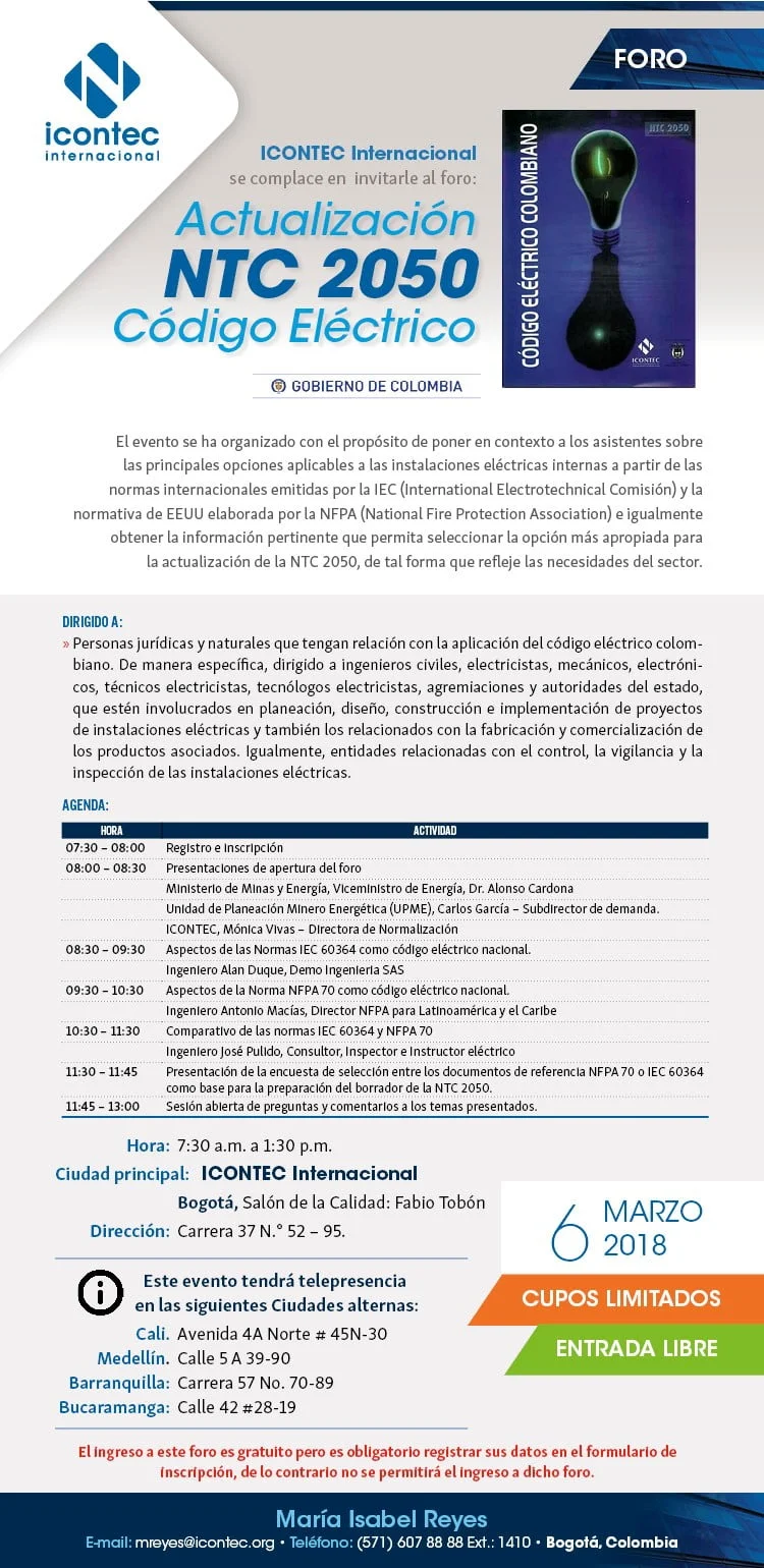 Foro: Actualización NTC 2050 Código EléctricoBlog por ANRACI - 19 febrero 201823 septiembre 2019 El próximo 6 de marzo, en el horario comprendido entre las 8 am y las 2 pm se llevará a cabo el Foro: Actualización NTC 2050: Código Eléctrico Colombiano. Está actividad se llevará a cabo en el Salón de la calidad del Icontec en la ciudad de Bogotá. Desde ANRACI COLOMBIA hemos conversado con NFPA y promovimos la participación directa de NFPA, que se integrará el panel de expertos por medio del Ingeniero Antonio Macias, Director de NFPA para Latinoamérica y el Caribe y experto en la NFPA 70 National Electric Code.De igual forma, podrán asistir al evento en las ciudades de Cali, Medellín, Barranquilla y Bucaramanga, en las oficinas del ICONTEC donde se dispondrá de un canal tecnológico dedicado para que los asistentes puedan participar de este importante evento desde las diferentes regiones del país.Podrán inscribirse en el Foro a través del siguiente vínculo: Inscripción al Foro. Compartir en Facebook Compartir Compartir en TwitterTweet Compartir en Linkedin Compartir