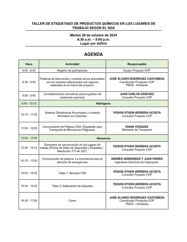 En el marco del proyecto COL 00112906 – 00115174, orientado a fortalecer la gestión de Contaminantes Orgánicos Persistentes (COP) en Colombia, le invitamos a participar en el Taller de etiquetado de productos químicos en los lugares de trabajo según el SGA.