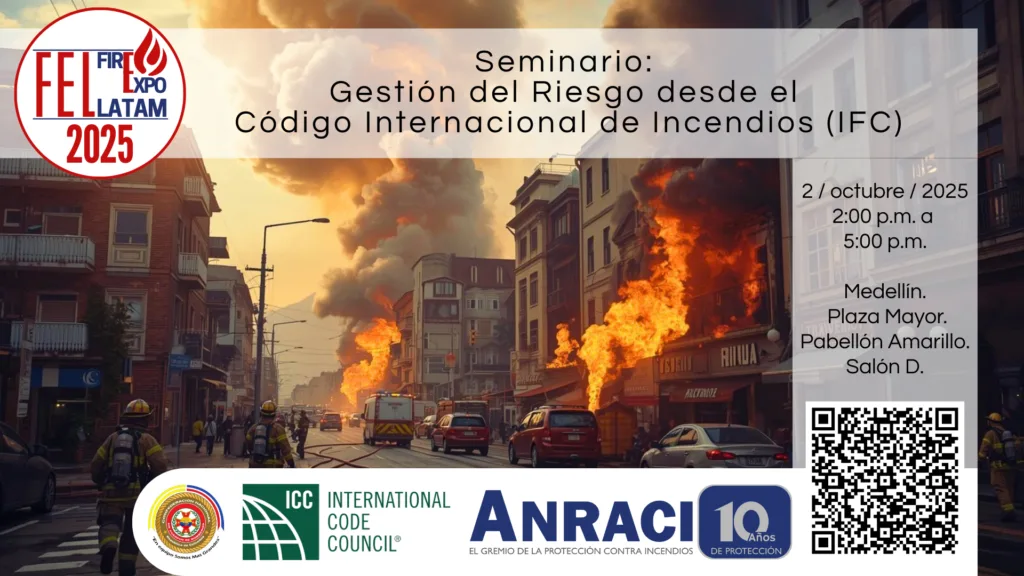 Seminario: Gestión del Riesgo desde el Código Internacional de Incendios (IFC)EventosFire Expo Latam por ANRACI - 8 septiembre 20258 septiembre 2025 Seminario: Gestión del Riesgo desde el Código Internacional de Incendios (IFC)La gestión del riesgo es una responsabilidad compartida entre múltiples actores del entorno urbano, industrial y rural, en otras palabras, es una responsabilidad de TODOS. En este contexto, el Código Internacional de Incendios (IFC) se presenta como una herramienta normativa esencial para abordar los desafíos que plantea la prevención y el control de incendios desde una perspectiva técnica, estructural y operativa.Este seminario busca ofrecer una comprensión integral del IFC, destacando su papel en la construcción de entornos más seguros y resilientes. A través de un enfoque multidisciplinario, se analizarán los principios fundamentales del código, sus aplicaciones prácticas y su articulación con otros marcos normativos internacionales.Este evento es posible gracias a la alianza estratégica entre el International Code Council (ICC) y ANRACI, quienes comparten el compromiso de promover entornos más seguros a través de la adopción de normativas internacionales. Esta colaboración permite acercar a la comunidad de la protección contra incendios los estándares globales en la materia, fortaleciendo la capacidad técnica de los profesionales y entidades dedicadas a la gestión del riesgo.Es de resaltar que, el seminario cuenta con el valioso apoyo de la Confederación Nacional de Cuerpos de Bomberos de Colombia, entidad comprometida con el fortalecimiento de las competencias técnicas de los bomberos. Su propósito es llevar conocimiento especializado a quienes, desde la primera línea, enfrentan emergencias por incendios, promoviendo así una cultura de prevención y respuesta efectiva basada en estándares internacionales como el IFC.Inscribirme en el Seminario.Objetivos.Brindar a los asistentes del Seminario una comprensión integral del Código Internacional de Incendios (IFC), destacando sus fundamentos técnicos, normativos y operativos desde la perspectiva de la gestión del riesgo, con el fin de fortalecer las competencias profesionales en el sector de la seguridad humana y la protección contra incendios en Colombia, promoviendo buenas prácticas en diseño, planificación y respuesta ante emergencias.Objetivos específicos.Analizar los principios normativos del Código Internacional de Incendios (IFC), con énfasis en su aplicabilidad en contextos latinoamericanos y su relevancia para la reducción del riesgo de incendios en edificaciones y espacios públicos.Fortalecer el conocimiento técnico de los profesionales vinculados a la gestión del riesgo mediante la exposición de buenas prácticas normativas, casos de aplicación y criterios basados en estándares internacionales.Fomentar el diálogo interdisciplinario entre ingenieros, arquitectos, bomberos, consultores y entidades reguladoras, en torno a la adopción de códigos modelo como herramienta para mejorar la seguridad, eficiencia y resiliencia de los entornos construidos en Colombia.Inscribirme en el Seminario.Acerca del Código Internacional de Incendios (IFC).Desarrollado por el International Code Council (ICC), el Código Internacional de Incendios (IFC) es una herramienta normativa esencial para garantizar la seguridad humana, la protección de bienes y la resiliencia de las edificaciones frente a incendios en todo el mundo.El IFC proporciona un marco técnico integral que regula aspectos relacionados con la prevención, detección, control y extinción de incendios, así como la evacuación segura de ocupantes, con el fin de minimizar riesgos y asegurar el cumplimiento de estándares internacionales en materia de seguridad contra incendios.Este código se actualiza periódicamente con base en investigaciones, aportes de comités técnicos, fabricantes, profesionales del sector y autoridades reguladoras, lo que permite que sus disposiciones estén alineadas con los avances tecnológicos, las mejores prácticas operativas y las necesidades emergentes en gestión del riesgo.El IFC no solo establece requisitos mínimos para edificaciones nuevas, sino que también ofrece criterios para la adaptación de estructuras existentes, considerando factores como la ocupación, el uso, la carga de fuego y los sistemas de protección disponibles. Su enfoque basado en desempeño lo convierte en una referencia clave para ingenieros, arquitectos, bomberos, consultores y autoridades locales que buscan construir entornos más seguros y preparados ante emergencias.Adoptar el IFC como guía técnica fortalece los procesos de planificación, diseño y operación de edificaciones, fomenta la armonización normativa entre países y contribuye a la creación de comunidades más seguras, sostenibles y resilientes frente al riesgo de incendios.En Colombia, su estudio y aplicación permiten enriquecer el diálogo técnico con las normativas nacionales, promoviendo una visión global de la gestión del riesgo basada en estándares internacionales.Inscribirme en el Seminario.Acerca del International Code Council.El International Code Council (ICC) es una organización sin ánimo de lucro con sede en Estados Unidos, reconocida mundialmente por desarrollar un conjunto de códigos modelo que sirven como referencia normativa para la construcción segura, eficiente y sostenible. El ICC ha liderado la creación de estándares técnicos que hoy son adoptados en miles de jurisdicciones alrededor del mundo.Entre sus principales aportes se encuentra el desarrollo del International Building Code (IBC), el International Fire Code (IFC) y otros códigos especializados que cubren áreas como plomería, energía, accesibilidad, mecánica y estructuras.El ICC también promueve la capacitación profesional, la certificación técnica y la armonización normativa entre países, contribuyendo a mejorar la calidad de vida, l