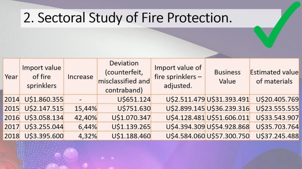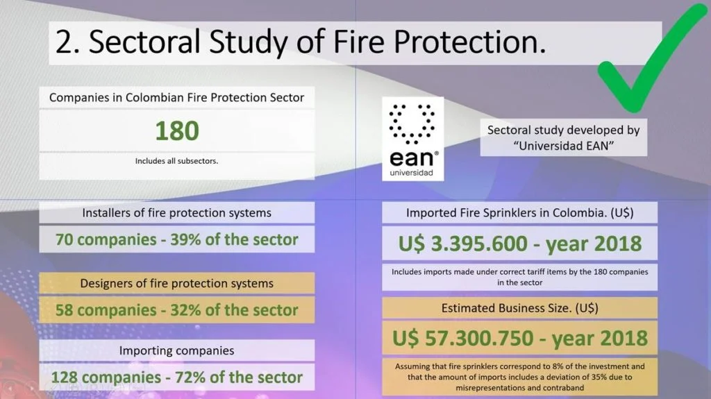 Estudio Sectorial PCIRecursos por ANRACI - 30 enero 202024 septiembre 2024 Queremos compartir el resultado final del I Estudio Sectorial de la Protección Contra Incendios en Colombia, actividad desarrollada en alianza con la Universidad EAN, bajo el liderazgo del ingeniero Jeffrey León, Director del Departamento de Procesos, a quien agradecemos su esfuerzo, trabajo y dedicación en el desarrollo de este importante documento.Gracias a los aportes de la comunidad de la protección contra incendios en Colombia, se recopiló la información y se realizaron importante ajustes con el fin de lograr una mejor focalización de los resultados, lo que se incluyó dentro del contenido final del estudio adelantado.Adicionalmente, con la información consignada en el estudio, y de manera preliminar, hemos realizado una estimación básica del tamaño del mercado del subsector de los rociadores automáticos contra incendios a base de agua para el año 2018, tal como se observa en las siguientes diapositivas.Es de señalar que la información anterior corresponde únicamente al subsetor de los rociadores automáticos contra incendio, no incluye datos acerca de otros tipos de sistemas, ni otros componentes como protección pasiva, puertas corta fuegos, detección y alarma, bomberil, etc.La idea que tenemos desde la Asociación, es complementar permanentemente esta información, ampliando la cobertura del estudio, con el fin de cobijar la totalidad de la protección contra incendios en Colombia.Descarga el Estudio SectorialDescargar Compartir en Facebook Compartir Compartir en TwitterTweet Compartir en Linkedin Compartir
